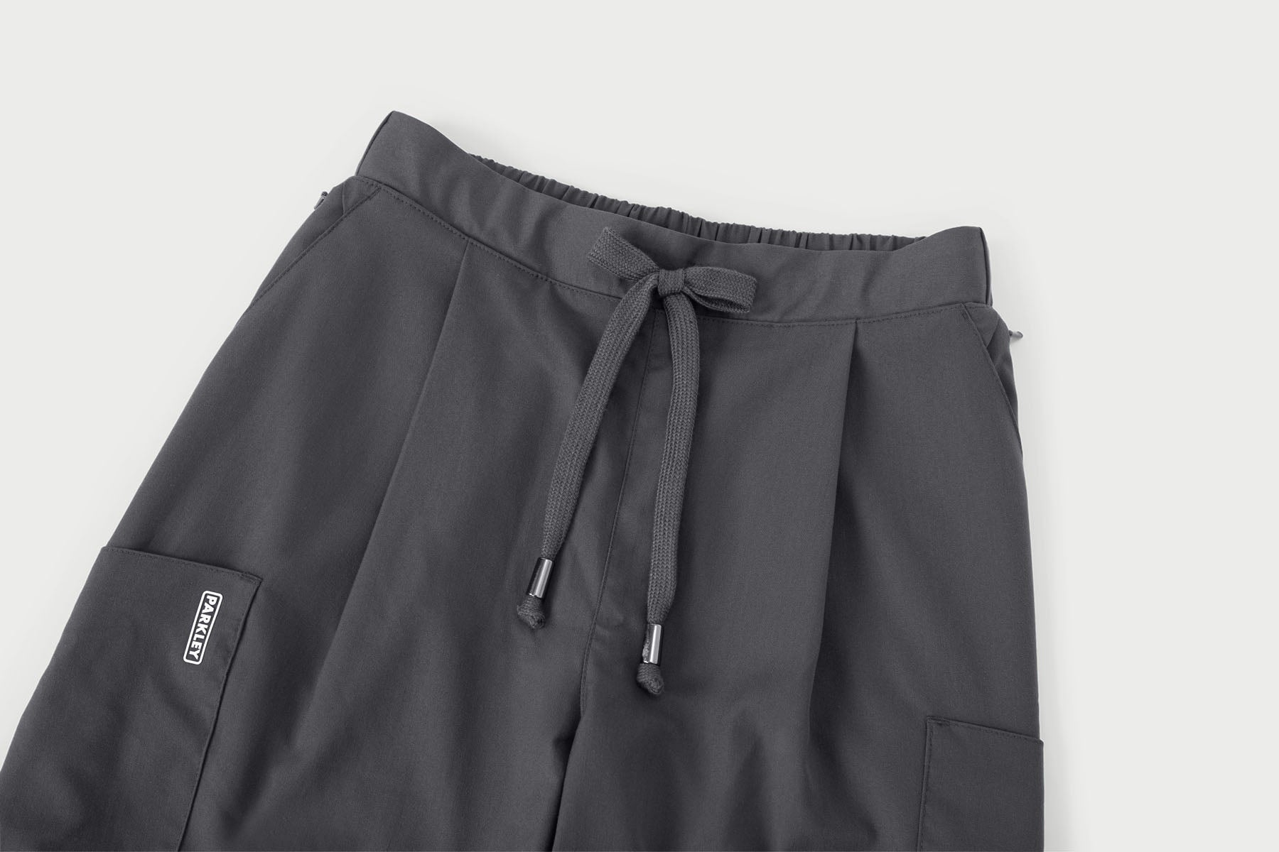 • Flat front waistband with drawstring, elastic back
